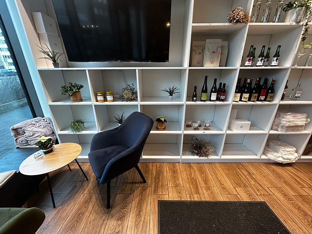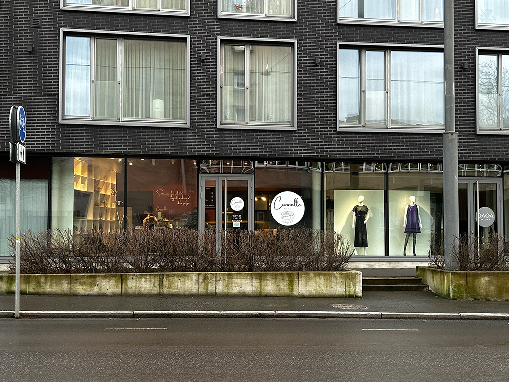冬に訪問しました関係で空は曇り、周囲の植木に緑はなく、北欧の冬の厳したを痛感しながら来店しました。
