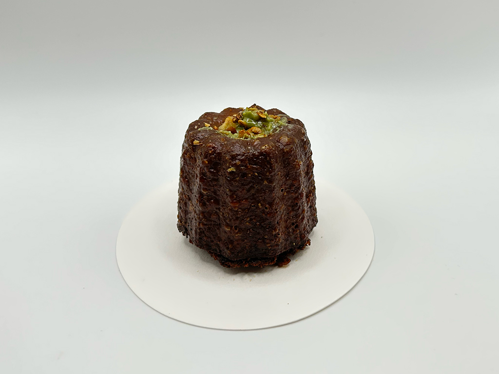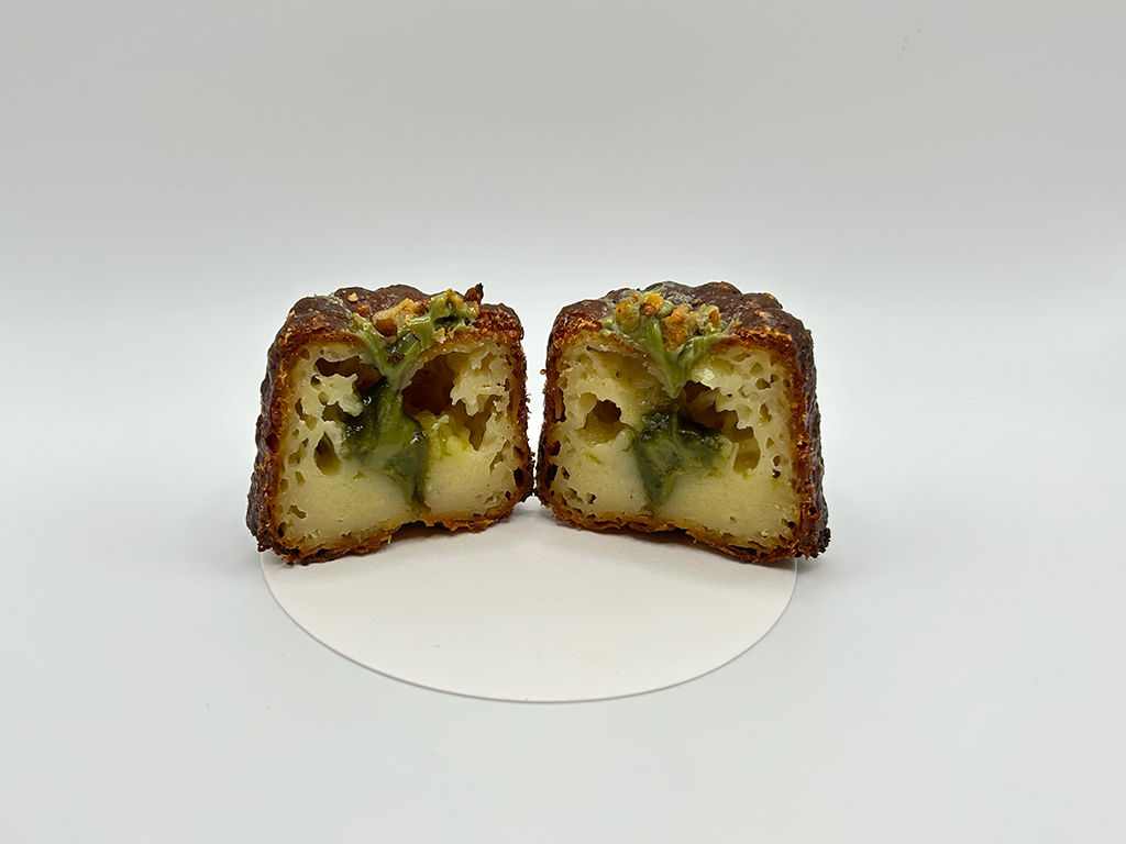 おそらくピスタチオソースとこれはアーモンドでしょうか?ピスタチオでしょうか?あるいは両方かもしれません。クランキーな味わいになっており、食感も楽しめるおいしいカヌレでした。生地はプレーンのカヌレと同じで中にピスタチオソースを注入している。そんな仕上がりでした。この店のカヌレはおそらく剥離剤に動物性の油脂を使っているのかもしれません。皮が非常に野生味のある香ばしさがあり初めて体感するワイルドな風味のカヌレでした。
