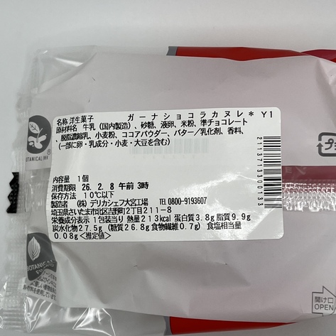 パッケージ裏面には栄養成分表示の記載があり、カヌレ一個のカロリーは213kcalと少しだけ高めですが、おやつとしては許容範囲と言えるでしょう。